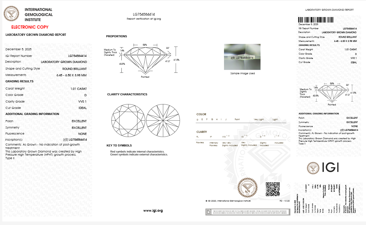 The Centerpiece: A Rare 1.01ct Diamond Selected for its absolute purity, this 1.01-carat laboratory-grown diamond sits at the apex of gemstone quality. With a D Color (completely colorless) and VVS1 Clarity, it is virtually indistinguishable from perfection.
